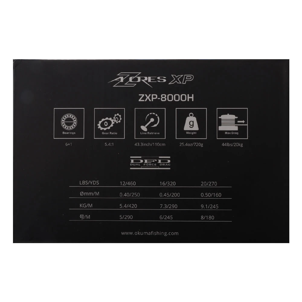 The Okuma Azores XP 8000 Spinning Reel begins with proven power features including die-cast aluminium body, side plate and rotor, machine cut pinion gear and the Okuma Dual Force Drag system that utilises a traditional top drag stack in concert with an oversized Carbonite drag washer beneath the spool to increase high-end drag output as well as spool stability under load.